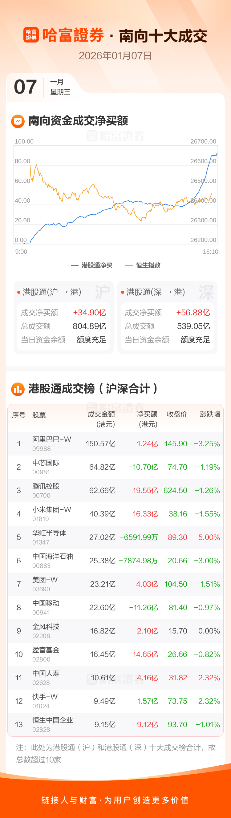 恒生指数1月7日跌0.94%,收报26458.95点。南向资金今日净买入港股91.78亿港元。南向资金今日成交额1343.93亿港元,港股大市成交2761.34亿港元。