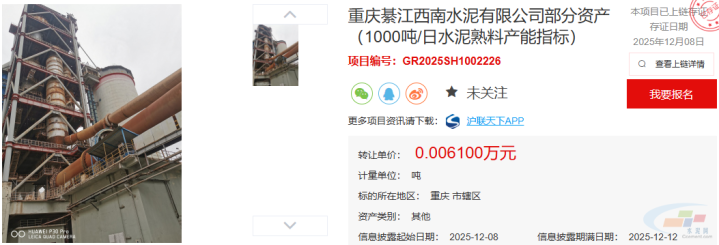 12月8日,重庆綦江西南水泥有限公司1000t/d水泥熟料产能指标转让,转让单价为61元/吨,总价1830万元。