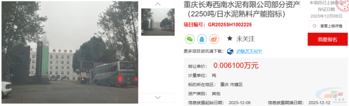 重庆长寿西南水泥有限公司2250t/d水泥熟料产能指标转让,转让单价为61元/吨,总价4117.5万元。