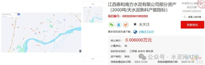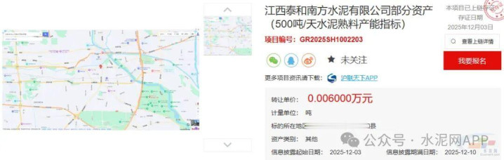12月3日,江西泰和南方水泥有限公司转让2000t/d、500t/d水泥熟料产能指标量华网,转让单价60元/吨,总价4500万元。