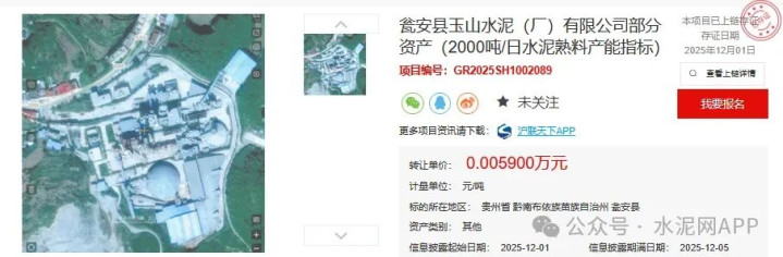 12月1日,瓮安县玉山水泥(厂)有限公司部分资产(2000t/d水泥熟料产能指标)转让,转让单价为59元/吨,总价3450万元。